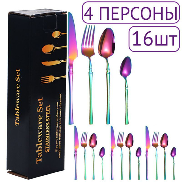 16 предметов! Набор столовых приборов ложек/вилок/ножей, радужный-16шт